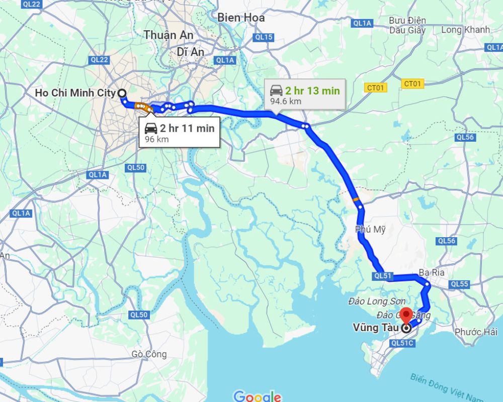 Option 2: From Ho Chi Minh City, you can take the Cat Lai ferry (in District 2, Ho Chi Minh City) to Nhon Trach (Dong Nai). This is the road that will lead to National Highway 51, the gate to Nhon Trach Industrial Park. If you choose to take this route, the distance will be closer to about 20 km. Option 3: You can also choose to follow the route from Ho Chi Minh to Vung Tau by car via the Long Thanh - Dau Giay highway, this road will help shorten the distance when traveling to Vung Tau to only about 2-2.5 hours. How to get from Ho Chi Minh to Vung Tau?Ho Chi Minh to Vung Tau by busA popular mode of transportation from Saigon to Vung Tau is by bus. Buses are available from a number of bus terminals in Ho Chi Minh City, including Tan Son Nhat Airport, Mien Dong Bus Station, Mien Tay Bus Station. Bus tickets from Saigon to Vung Tau range from $4 to $10 per seat, and the trip takes around 2.5 to 3 hours. Additionally, several private minivans travel to Vung Tau from Saigon's Tan Son Nhat Airport. Buses arrive at many locations, including as Ba Ria, Hoa Mai, and Vung Tau Bus Station. If you purchase your bus tickets online, you will be presented with this information.